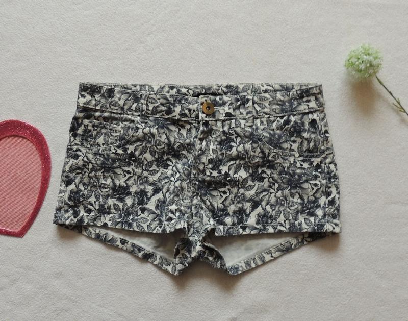 підліткові котонові шорти в квіти біло-сині в квіти. за етикеткою 4- що відповідає найменшому жіночому розміру в поясі 35 може тягнути до 40 утяжок немає в бедрах тягнеться до 52 бічний шов самий мінімальний 22 стан ідеальний