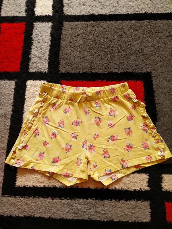 Жовті,фірмові шорти в квіти для дівчинки 7-8 р Довжина-23 см,пояс-26 см,стегна-36 см.