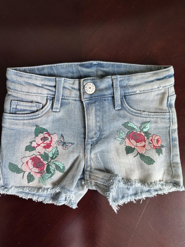 Джинсові шорти, декоровані квітковим принтом. Застібка на кнопці і блискавці, є утяжки- резинки на поясі