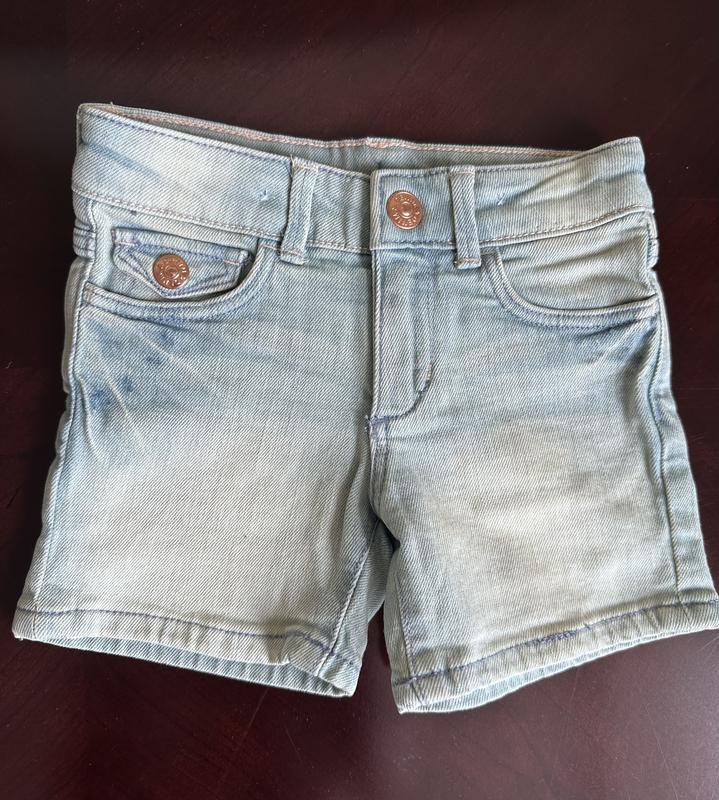 Джинсові шорти, злегка тягнуться. Кармани на кнопках,, є утяжки на поясі.