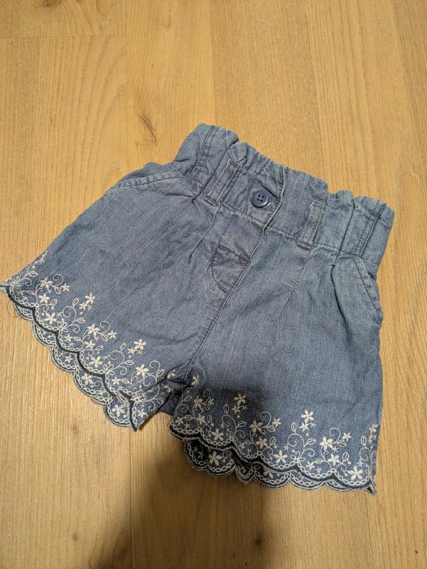 Тоненькі, легенькі з ніжною вишивкою. 9-12 міс.74-80см,згідно бірки.4 кишеньки: 2 попереду та 2 позаду. Заміри: довжина 25,5 см.кроковий 5 см. ширина в талії 20,5 см.(можна потягнути до 25 приблизно) бедра 28 см.