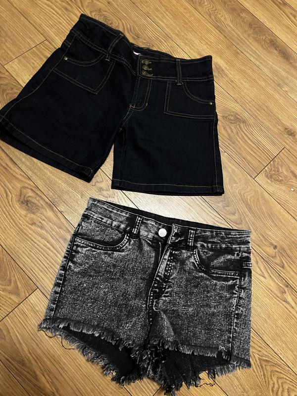 Темно сині шорти мають завищену талію довжина бокового шву 35 сантиметрів нот 35 см мають у тяжку посадка 22 см ціна 350 грн , сірі джинс стрейч бок 25 см нот 35 см ціна 270 грн