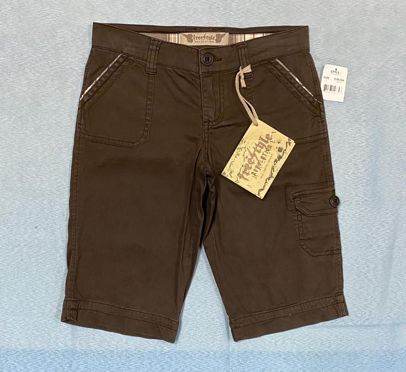 Шорти для дівчаток американського бренду Freestyle Revolution , виконані в шоколадному кольорі , виробництво Бангладеш , матеріал ( тонкий, стрейчевий ) :: 98% бавовна , 2% спандекс ! Шорти стрейчеві з низькою посадкою з бічною кишенею ! Розміри: 10 : ширина в талії - 33 см, ширина в стегнах - 39 см, довжина - 45 см , посадка ( перед ) - 18 см , ширина штанини ( низ ) - 18 см .