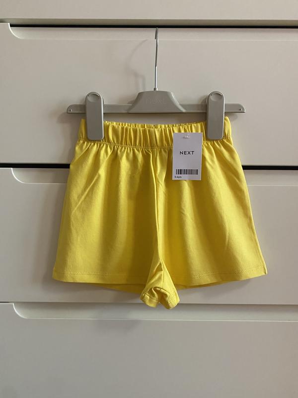Шорти для дівчинки від NEXT. Нові, з біркою. Склад тканини - 100% бавовна Літні легенькі шорти, тоненька тканина. Колір у наявності - жовтий. Розмір у наявності: 🔸3-4 р. (104) Заміри: ширина в поясі (півобхват) - 23 довжина по зовнішньому шву - 25