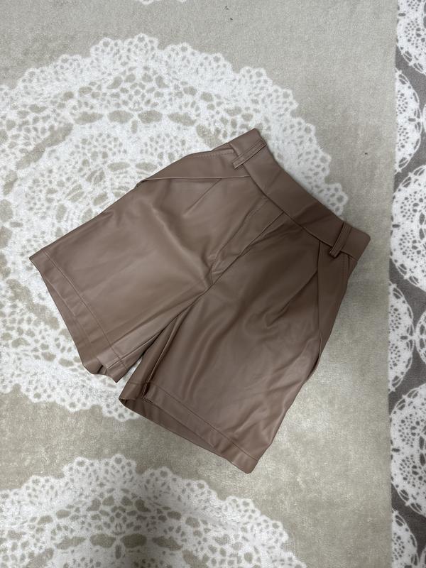 Шорти класичні під шкіру в стані нового. Підійдуть на худеньку дівчинку. Довжина 35 см, стегна 84 в обʼємі, талія 56 см на резинці. Резинка туга. Шорти тягнуться трішки. Колір какао, мокко.