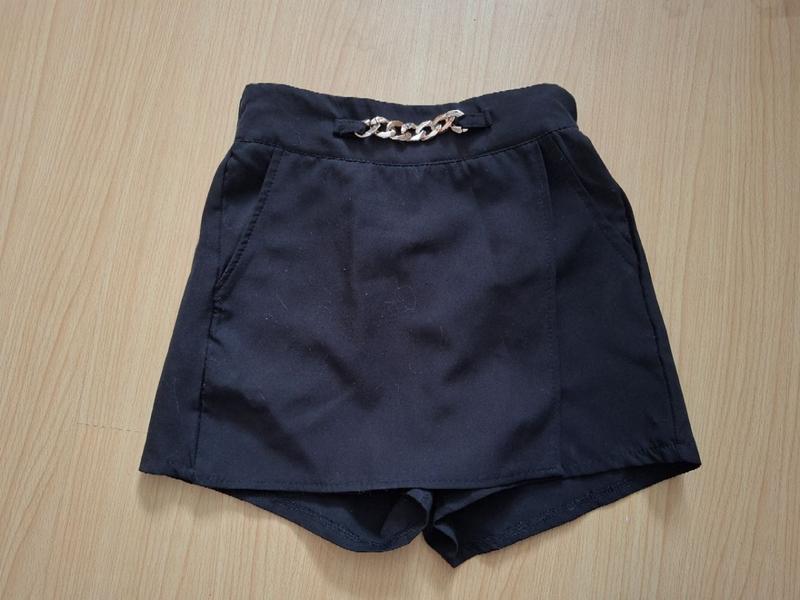 Шорты-юбка для девочки. Стильные черные шорты с эффектом юбочки (симметричный запах спереди). Аккуратный крой, красиво сидят, не сковывают движений, есть карманы. Декор - цепочка на поясе, добавляет модный акцент. Рост 134 см. Ткань приятная на ощупь, подходит для теплого времени года. Состояние очень хорошее, без пятен и повреждений. Идеально для школы, прогулок или праздничных образов.
