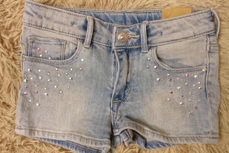 Відмінні шорти з мягенького джинса. спереду нашиті камінчики. розміри: довжина -21 см, ширина в поясі -29 див. є резинка для регулювання