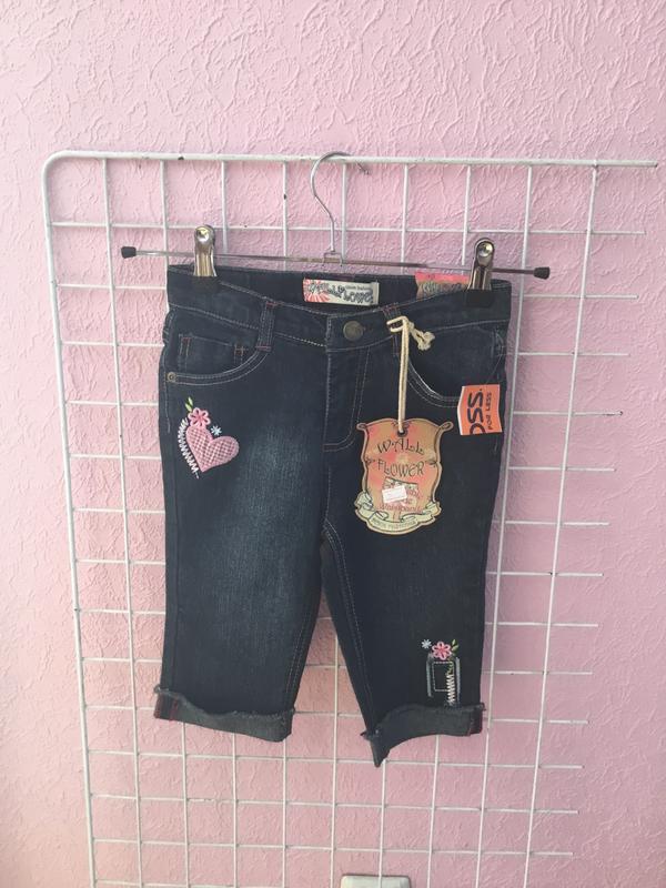 Стильні, джинсові бриджі для дівчаток, на ріст 110-116, відмінної якості, ідеально підходить для літа і під будь верх. Нові з біркою. По талії йде стяжка.