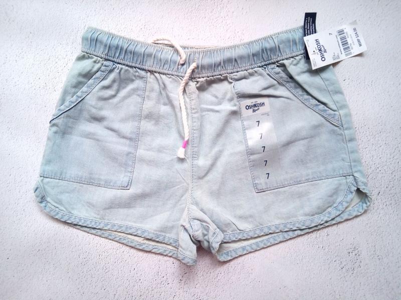 Нові шорти OshKosh для дівчинки. 100% бавовна. Пояс на резинці, плюс додатково регулюється шнурком. Попереду бічні кишені. Колір - блакитний джинс. Розміри: залишився тільки розмір на 6 років. Розмір 6 років: ПОТ – 28 см, ПОБІДИ - 34 см, довжина – 22 см