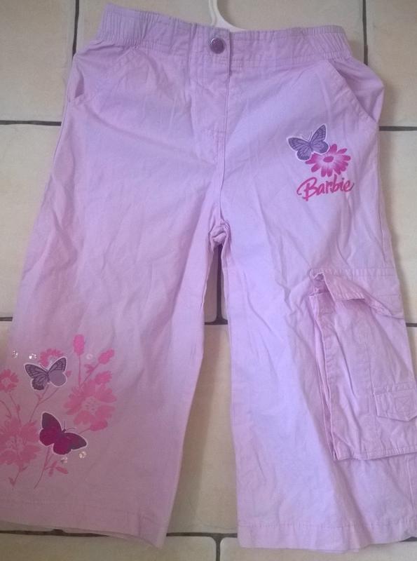 Хорошие коттоновые капри на девочку лет 4-5. В очень хорошем состоянии, никаких изъянов нет. Бренд Barbie. Цвет розовый. Замеры - ПОТ 26-28, посадка 20,5, длина 51.