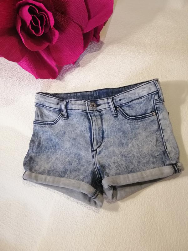 Жіночі джинсові шорти на дівчинку, стан ідеальний. Напівобхват талії 31см,довжина спереду 20,5 див. Спереду кишені обманки, ззаду справжні, також є резинка-утяжка.