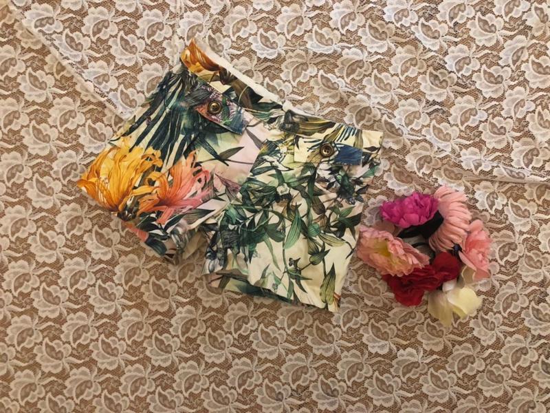 Состояние отличное, без нюансов. Талия регулируется резинкой. Длинна 22см. Ширина по бёдрам 35см.