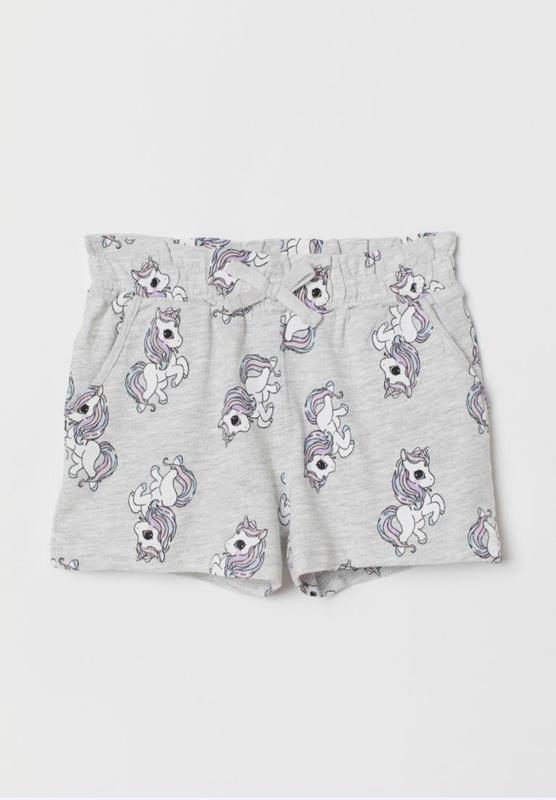 Трикотажні шорти для дитини шведського бренду H&M. Тканина-100% бавовна. Колір - сірий в принт поні. Розмір в наявності на зріст 92, 98/104см.