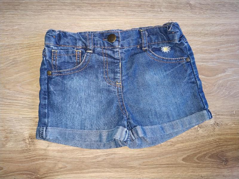 джинсовые шорты F&F размер 2-3, будет дольше, примерно до 5л длина 20см, пояс на утяжке состояние отличное, потёртости были