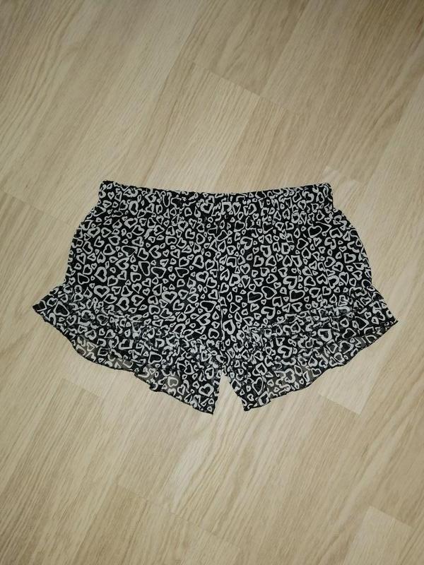 Короткі шорти для дівчинки. Верх шифон, принт - сердечка, всередині - підкладка, трикотаж. поліестер. По низу брючины - рюшки. дуже симпатичні, легені. Пояс на широкій резинці. Розмір - 13-14/158. стан нових. заміри: Довжина - 20/7 Пояс - 64 - 76 см Брючина низ обхват - 50 см Середній передній шов - 19 см Задній середній шов - 30 см