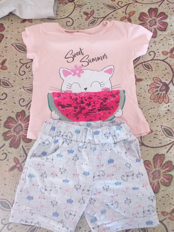 Поодам летний комплект для девочки. Есть не большое пятнышко на футболке и шортиках. Но для песочницы в самый раз.