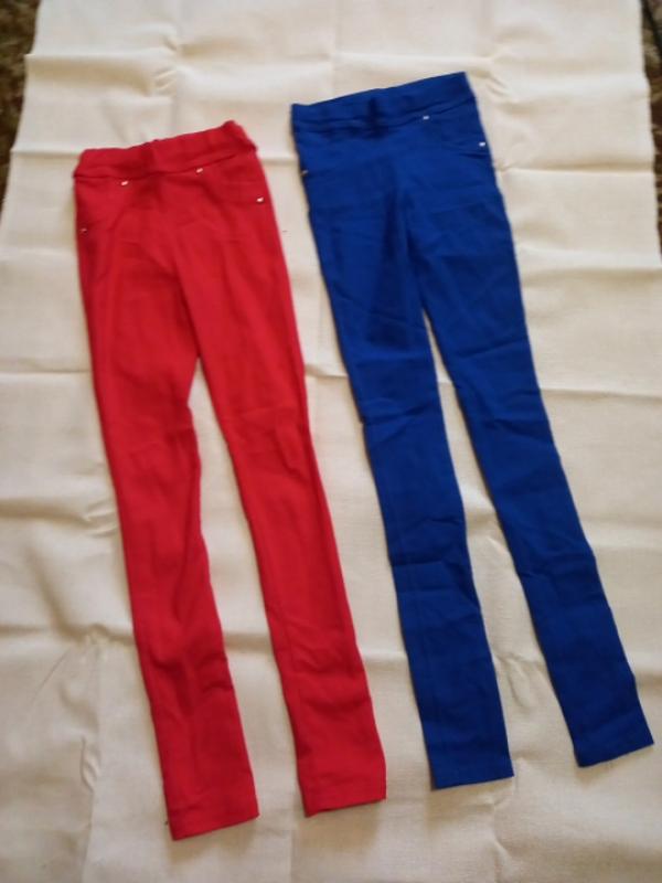 Штани лосіни,котон.Червоні раз оділа,василькові ніразу.Пише більший розмір,маломірить.На худеньку.Брала на 146.Не обрізати,можете звертати якщо задовгі .Червоні 150,сині 200 грн