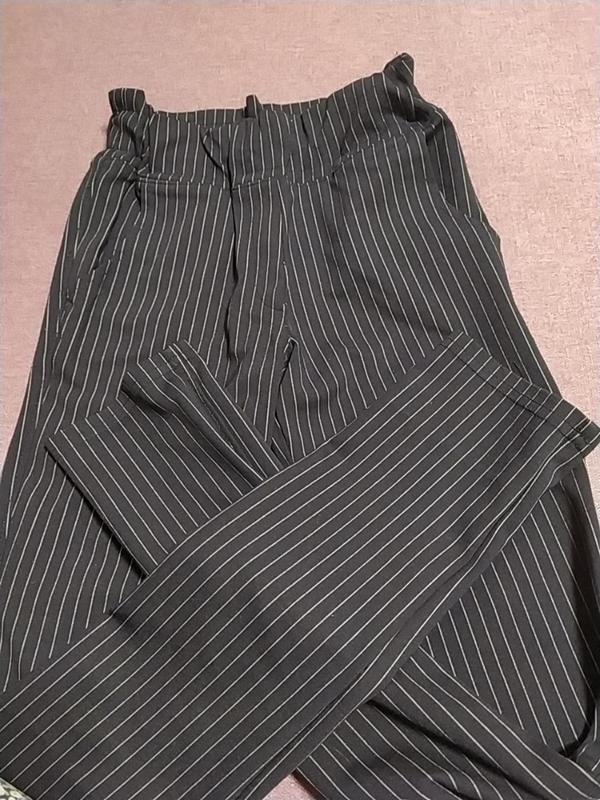 Штанці, темно сині в тоненьку смужку, що ідеально підійдуть в школу, висока посадка, функціональні кишені, в поясі резинка. Підійдуть на худеньку, на останньому фото недолік - трішки пішли по шву, не критично, адже внутрішній шов тримає, однак потрібно підшити.