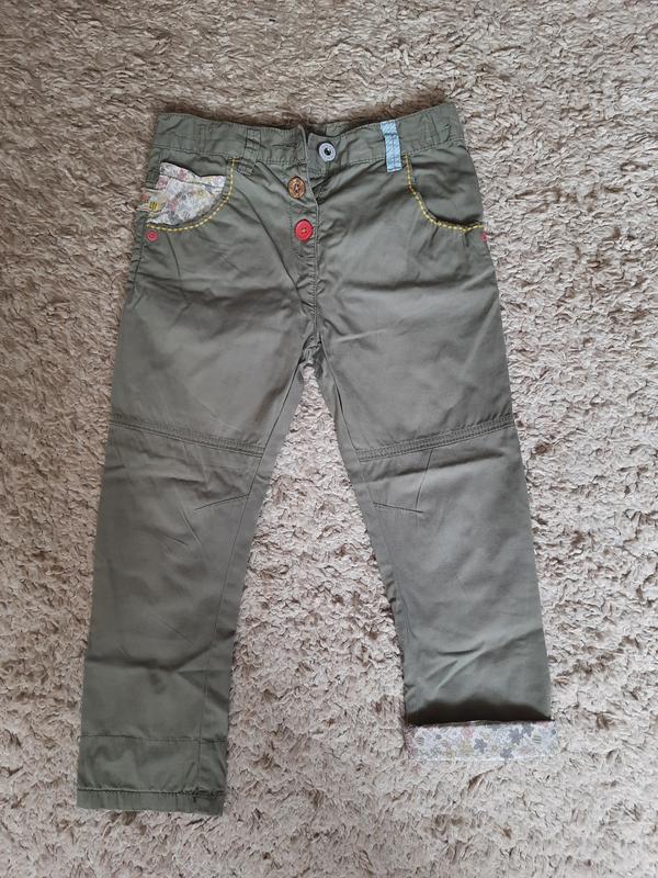 Мегастильні котонові штани Next на дівчинку, розм.110, але трішки більшомірять, вік 4-6 років, низ підкачується, тому якщо відкачати можна і до 7 років носити, колір хакі (зелено-сірий), квіткові вставки знизу і на кишеньці, крій вільний, легенькі, 250грн.