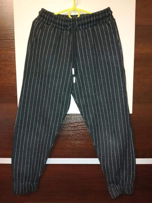 Брюки в нормальном состоянии, но есть след, когда спели коленом (не дирка, показала на последнем фото). Длина 71 см, ПОТ 27 см (резинка, затягивается шнурком), ПОБ 41 см.