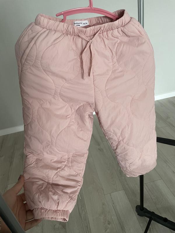 В ідеальному стані, дитячі штани на дівчинку 98см. Ніжно-рожевий колір. Пояс на резинці+регулюється додатково шнурочком. Знизу штани на резинці. Легкі, осінь або зима під теплі підштанники . Утеплені тонким синтіпомон.
