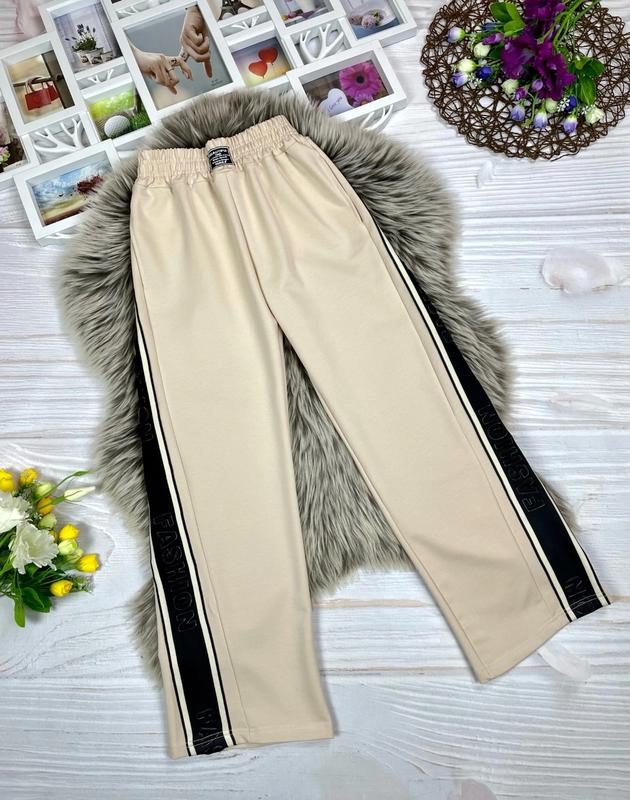 Стильні штани палацо для красунь 💗💗💗 лампас з написом ефект 3Д пояс широка резинка, гарно тягнеться тканина турецька двонитка пеньє Не кошлатиться Заміри: довжина/крок/пояс/бедра 140 - 92/66/28/47 146 - 95/70/28/49 152 - 99/73/29/51 158 - 102/76/30/52 164 - 105/78/31/53