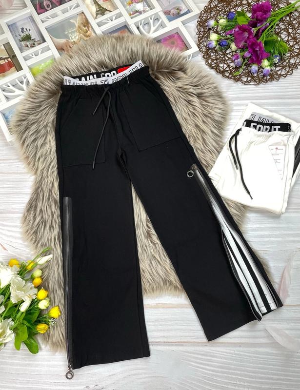 Круті штани для красунь 💗 накладні кишені, блискавка по боках 🔥 яку можна ростібнути тканина стрейч-котон Пояс широка резинка + шнурівка Заміри: довжина/крок/ширина в бедрах/пояс 128 - 82/56/33/26 140 - 87/60/35/28