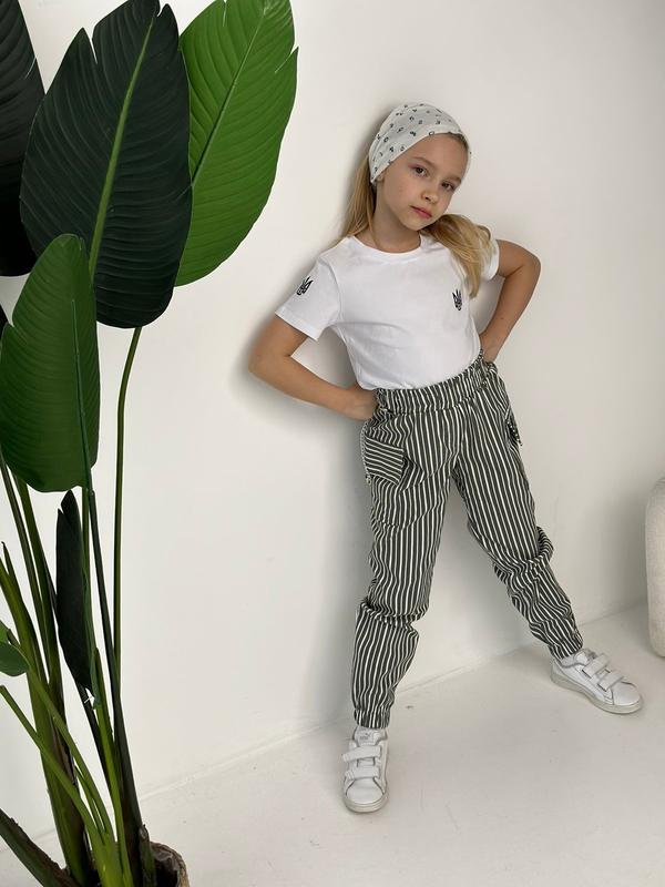 крилова Стильові котонові джогери у трендову смужку 🤩🤩🤩 В поясі широка зручна резинка 😌 дві глибокі діючі кишені 👌🏻, ланцюжок зʼємний 🔗 Тканина: котон 🩶 Виробник: Україна 🇺🇦 ЗАМІРИ ⤵ +/- 1-2см!!! р.134-довжина 81 см/крок 58 см/ПОС 43 см р.140-довжина 84 см/крок 62 см/ПОС 44 см р.146-довжина 87 см/крок 64 см/ПОС 45 см р.152-довжина 90 см/крок 67 см/ПОС 46 см р.158-довжина 93 см/крок 68 см/ПОС 47 см