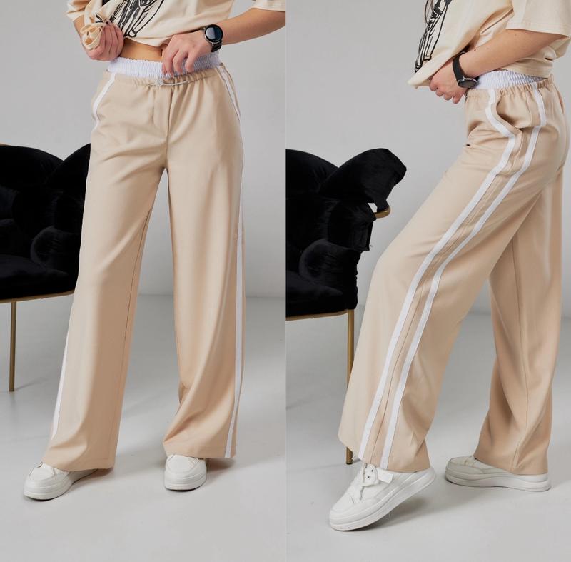 Арт 4854 Трендові брюки Весняно-літнього сезону із вставним поясом У поясі є утяжка та боковими полосками З кишенями Тканина-Бостон Якість супер Зріст/довжина/крок/пот/поб похибка+-2см 140-146/83/62/23/42-1шт 146-152/87/65/24/44-1шт 158-164/93/71/26/46-2шт тан