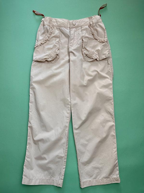 Дуже легкі бежеві штани для дівчинки 6-7 років, розмір 122. Матеріал ідеальний на літо. Дві кишені спереду, дві ззаду. Є малесенький дефект, зачіпка на одній кишені спереду, додала фото з нею. В решті, стан чудовий.