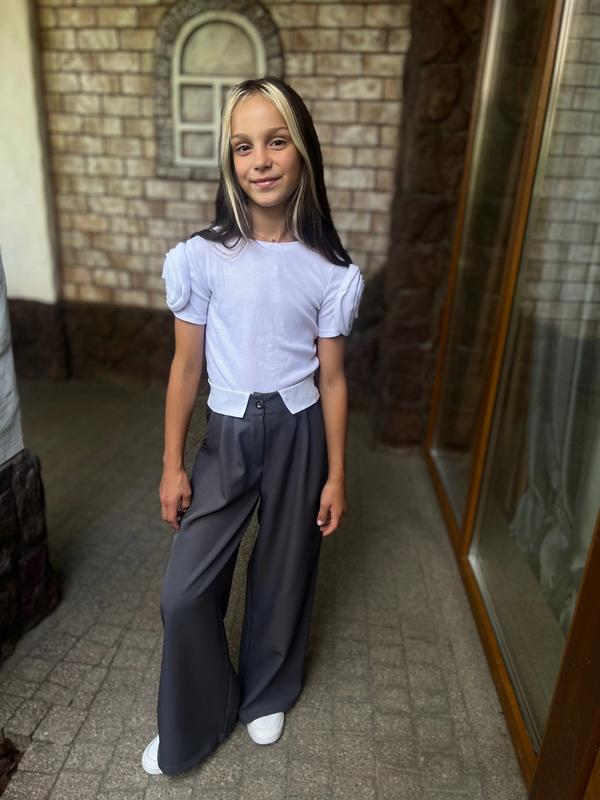 Штани-палаццо з цікавим поясом Тканина: Креп-костюмка Ідеальна посадка Є дві функціонуючі кишені Розміри: 128см 134см 140см 146см 152см Заміри: довжина/крок/бедра/пояс 128 - 8********** - 83/60/39/29 140 - 87/65/40/30 146 - 92/68/41/31 152 - 96/70/42/32