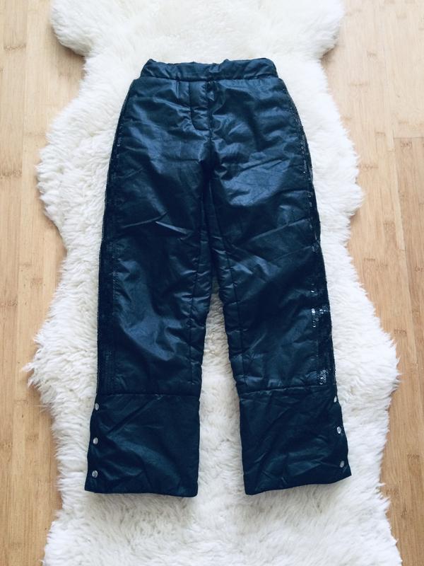 Mone. Дизайнерська одежа 128 зр. Штаніки на синтепоні з чорними блискучими паєтками на лампасах. Стильна, актуальна, трендова модель, внизу на кнопках. Стан нової речі. Брендова фурнітура, не продуває , не промокає, ніжна плащівка. довжина 73; крок 53; пот 25 резинка; Пос 43