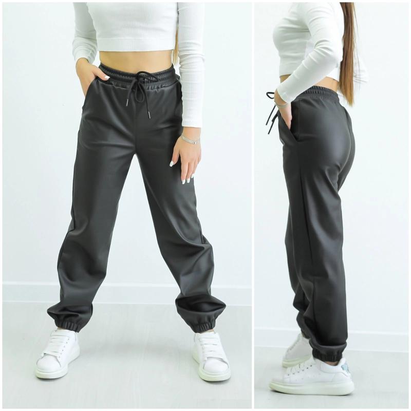 В наявності Шкіряні джогери для дівчат. Шнурок в поясі функціональний. Є кишені, знизу на резинці. Тканина - еко шкіра без утеплення. Заміри: 134 довжина - 85см, крок - 61см, пояс - 27см. 140 довжина - 88см, крок - 63см, пояс - 28см. 146 довжина - 93см, крок - 66см, пояс - 29см. 152 довжина - 97см, крок - 70см, пояс - 30см. 158 довжина - 101см, крок - 73см, пояс - 31см.