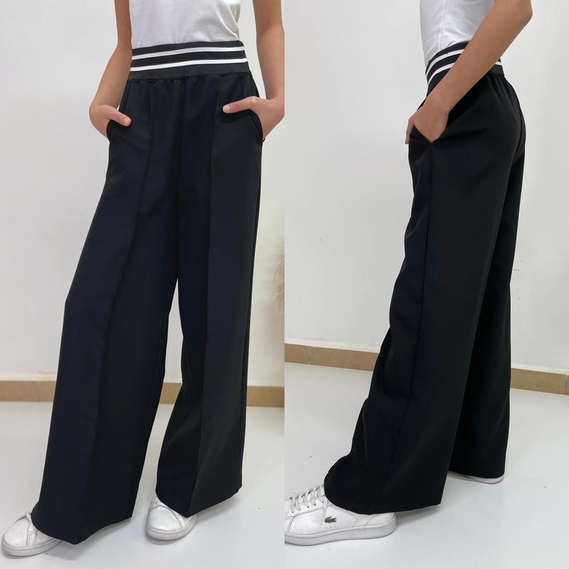 Классические брючки-палаццо Для стильного образу а также на каждый день в поясе широкая резинка, красиво тянется по переду высточка-стрелка ткань брючная средняя плотность Имеет легкий стрейч Рост/длина/шак/пот/пос похибка+-2см 134/84/58/26/37 140/88/61/26/38 146/92/64/27/39 152/96/67/28/40