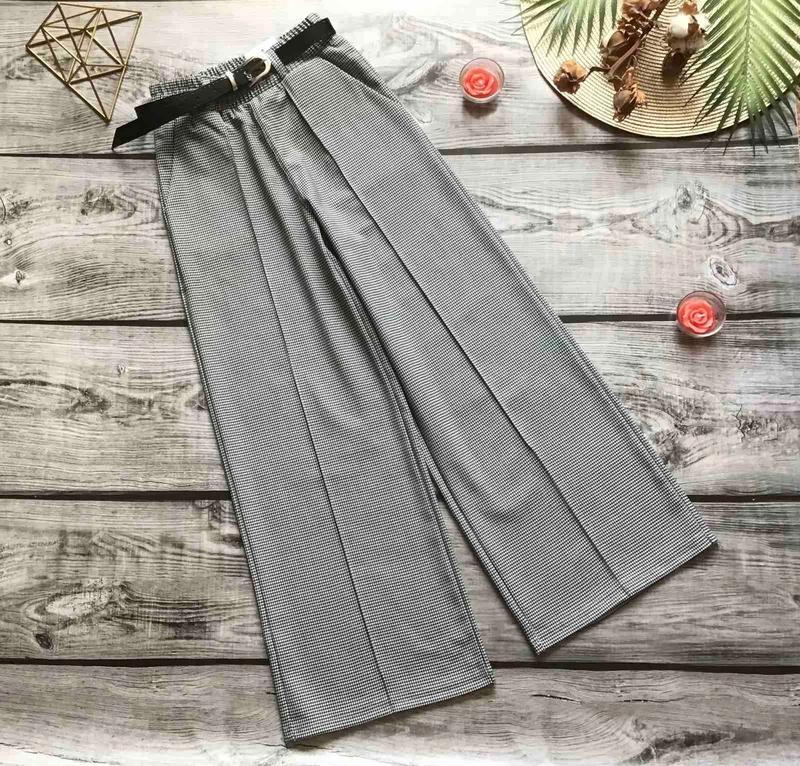 Штани палаццо для дівчат. Є кишені. Широкий пояс. Поясок в комплекті. Тканина - трикотаж. Заміри: 128 довжина - 79см, крок - 57см, пояс - 24см, напівобхват бедер - 38см. 134 довжина - 82см, крок - 59см, пояс - 25см, напівобхват бедер - 40см.