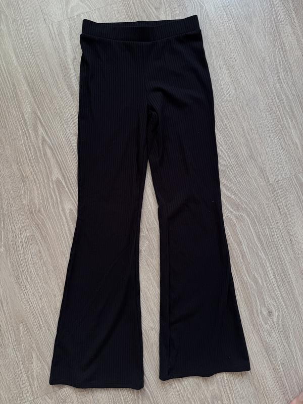 Брюки для дівчинки років 10, чорного кольору, кльош, в рубчик. Довжина виробу 86 см. Резинка пів обхват 30 см. Пів обхват стегон 33 см.