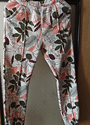 Брюки универсальны с карманами из мягкого теплого трикотажа. На поясе резинка и декоративный хлопковый шнур. Низ штанины фиксируется резинкой. материал: трикотаж с начесом (60% хлопок, 40% полиэстер). Длина 91, шаговый - 64 см. В отличном состоянии. Одетые пару раз