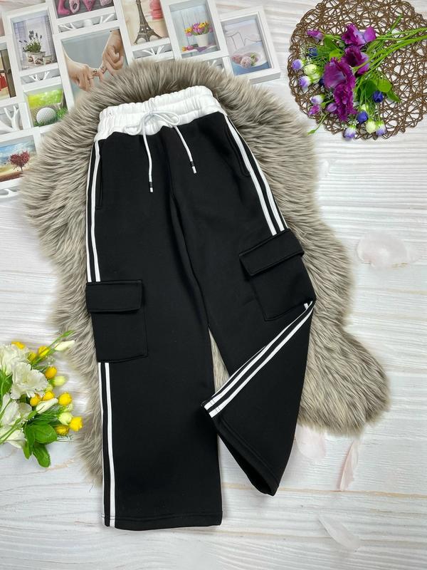 Теплі штани карго з лампасами 😍 Пояс широка резинка стягується шнурівкою, збоку накладні кишені Тканина - турецька трьохнитка на флісі, якість 🔥 Колір - ЧОРНИЙ З БІЛИМИ ЛАМПАСАМИ Заміри: довжина/крок/пояс 134 р. - 83/60/26 С. Р.