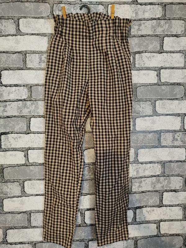 Фірмові джогери в клітинку, чорно- бежевого кольору. Цікаві та зручні. Пояс на резиночці по спинці, матеріал не тягнеться, без замочка . Посадка висока . Будуть на 11-12 років . Пояс в спокійному стані 30 см Бедра 42 см Довжина від пояса 86 см, від пройми 62 см