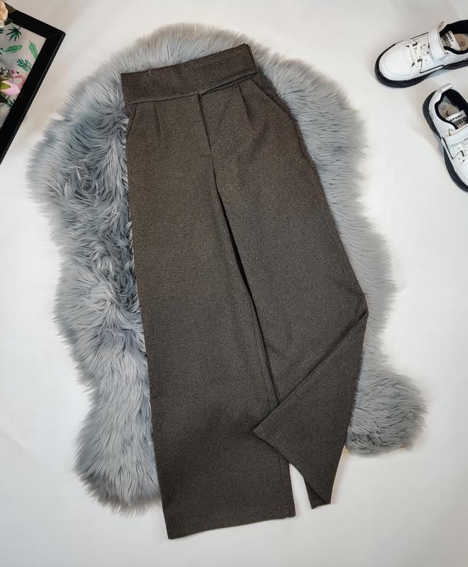 Палаццо , тканина шерсть гарної якості темно-сірого кольору , гарно спадає, приємна до тіла . Спереді штанішок складочки, застібка на липучці, з блискавкою, задня частина пояса на резінці. заміри:довжина/крок/пояс 134-87/63/27