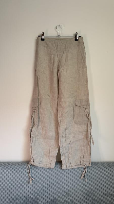 Довжина по боковому шву 90, по внутрішньому 72, талія 33, посадка спереду 20, посадка ззаду 30. Штани з льону 100%, на кокетці, є дві кишені по боках, внизу на стяжках (можна регулювати).