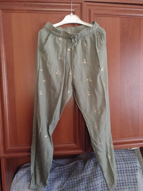Це дитячі штани-джогери від бренду H&M у кольорі хакі (оливковий зелений) із золотистим принтом у вигляді вишень. Характеристики товару Тип: Легкі ткані штани (джогери). Матеріал: М'яка віскозна тканина. Особливості дизайну: Еластичний пояс із декоративним бантом або зав'язками. Бічні кишені. Звужені штанини з еластичними манжетами внизу. Принт у вигляді золотистих вишень по всій поверхні.