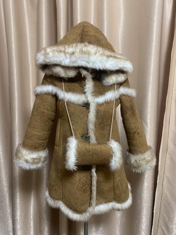 Детская дубленка с муфтой дубляж на возраст 5-6 лет, теплая на искусственном меху Цвет коричневый Длина 71см Длина рукава от плеча 46см, от горловины 56см Плечо 36см Полуобхват груди 43см Полуобхват талии 45см Полуобхват бедер 51см Застежка пуговицы Капюшон отстегивается Муфта 20*10,5см 2 кармана Состав 100% полиэстер