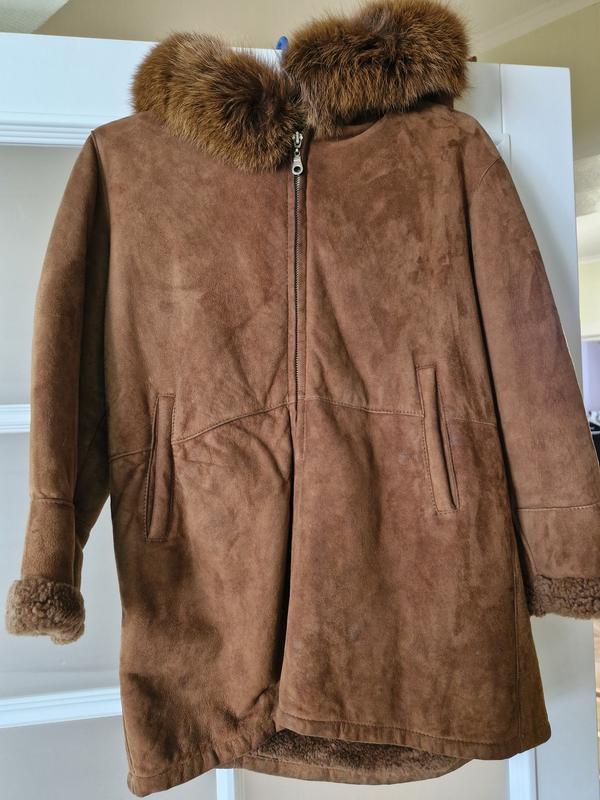 Натуральный мех, коричневая, с капюшоном, на 7-9 лет, длина 85 см, ширина 50 см, длина рукава 47 см. Есть маленькое пятно на рукаве.
