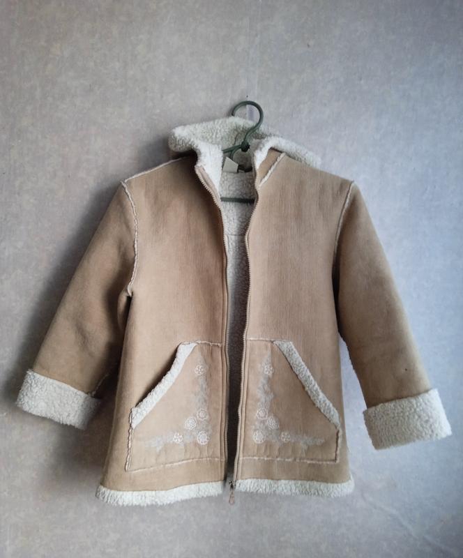 Дублёнка с капюшоном, искусственная. Утеплитель по всей длине и рукавах. Капюшоном не снимается. По бирке указано 8-9 лет. Замеры: ПОГ от шва до шва по верху изделия 44 см , длина 60 см., длина рукава от плечевого шва 44 см.