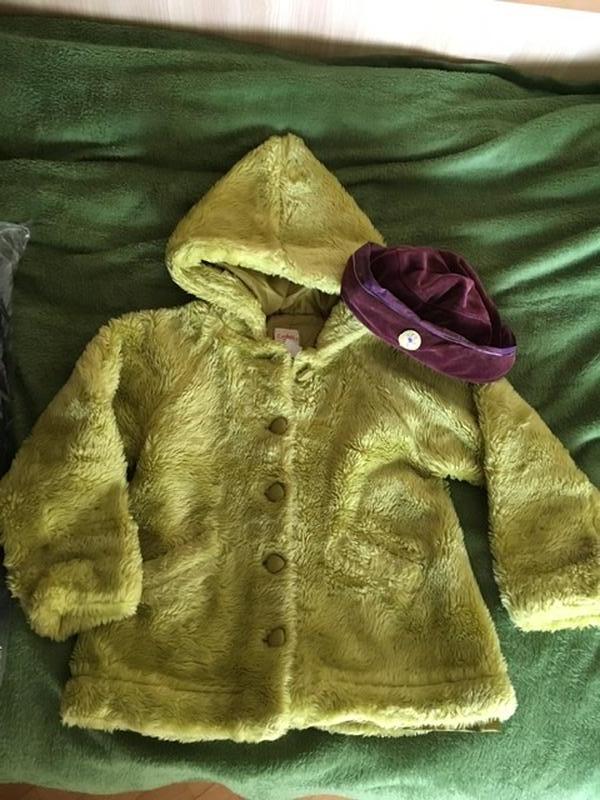 Французька шубка з штучного хутра , оливковий колір, тонка швидше на +10-13 тепла. В комплекті шапка - шапочка велюрова