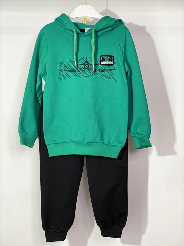 Костюм для хлопчика 2 ріки 92 см, кофта худі з капюшоном зеленого кольору тканина двунитка, штани чорного кольору тканина двунітка на широкій резинці в поясі з боків кишені. Заміри: кофта рукав 35 см, ширина під проймою 31 см, довжина 40 см, штани - пояс 22 см, довжина 50 см, крок 31 см.