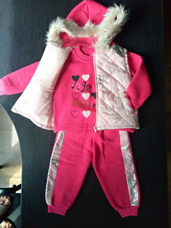 Дуже красивий, тепленький костюм з утепленою жилеткою. Турція. На 1,5-2 роки. Дивимось на заміри: Костюм з начосом, 100% котон: кофта - ширина 32 см, довжина 37 см, довжина рукава 31 см; штани - ширина в бедрах 33 см, довжина 45 см. Жилетка на синтепоні, з кишеньками і капюшоном: ширина 34 см, довжина 36 см.
