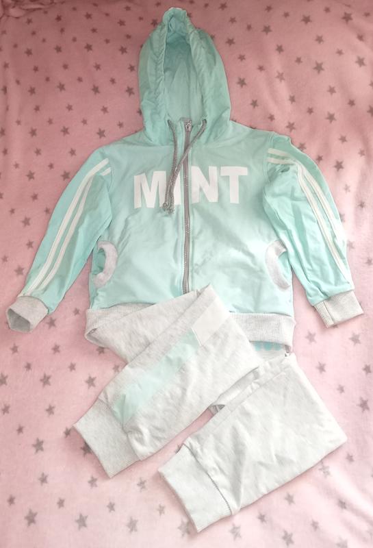 Зручний спортивний костюм м'ятно-сірого кольору в ідеальному стані без дефектів. Верх на блискавці, штани з однією кишенею. Матеріал - двохнитка. Верх: напівобхват грудей - 36 см, напівобхват низу - 37 см (тягнеться), ширина плеча - 34 см, довжина рукава - 39 см, довжина виробу - 43 см. Штани: напівобхват талії в спокійному стані - 27 см (можна регулювати шнурком), довжина зовнішнього шву - 70 см, довжина крокового шву - 52 см.