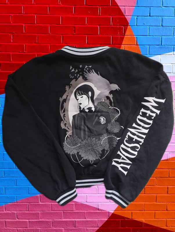 Класний бампер ,утеплений,на спині малюнок з серіалу Wednesday